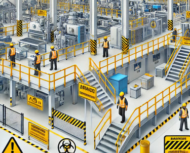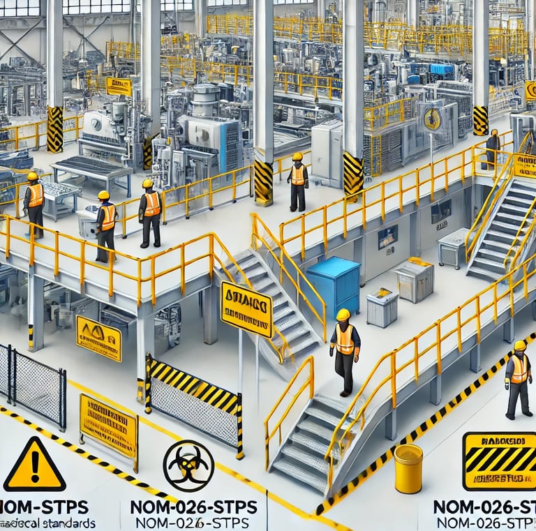 La baranda o guarda perimetral diseñada para proteger pasillos o zonas de tránsito en plantas industriales. En México, estas estructuras suelen estar reguladas bajo las normas de seguridad laboral de la Secretaría del Trabajo y Previsión Social (STPS), en particular la NOM-001-STPS-2021 y la NOM-009-STPS-2011
